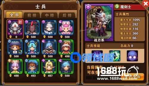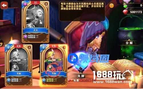士兵刚解锁出来,数量是零,且属性都是最基础的,当然这里的最基础也是比低阶的还要强很多很多。解锁士兵后的我们就需要生产士兵和强化士兵的属性了。怎么增加属性呢?在这里我们又要介绍到一个新功能--占卜屋。在占卜屋里,每天我们都有几次机会可以占卜卡片,要增强什么系的士兵,那么我们就尽量多的激活该系的卡牌,占卜的卡牌数量和属性都是可以叠加到士兵身上,到了后期,士兵的实行甚至可以强过英雄。这都是一个积累的过程。