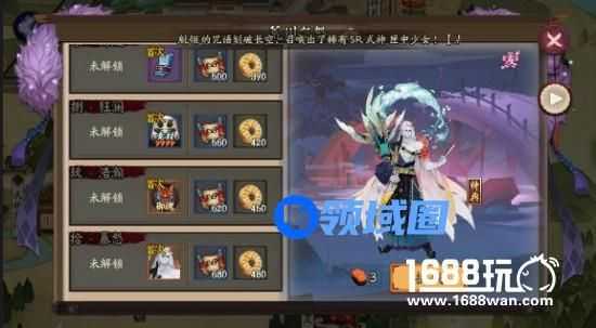 前排:以玩家的视角来看,从左至右,依次为桃花妖、雪女、青行灯、姑获鸟、惠比寿。