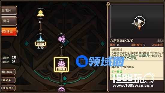 九尾激光EX:中远距离的定点AOE技能,输出量不俗并且有降低致命一击概率这一额外属性,可以减少boss的输出,伤害之余还略带一些辅助效果,十分不错的技能。而且是一个瞬发型技能,技能判定十分优秀,从出现激光到轰击爆炸区域全过程都有伤害判定,可以利用卡身位这类的小技巧,对部分体型巨大的boss打出多段伤害。同时爆炸范围很大,也可以用作清理杂兵,总体而言是一个十分全面的技能,点爆发与AOE兼备,是时空领主在PVE中的神技。