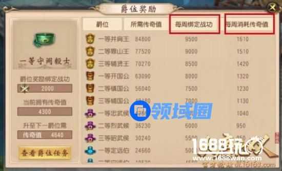 难度越高的爵位任务,获得的传奇值越高,每周结算时会根据当前的传奇值获得一定数额的绑定战功,也会扣除一定量的传奇值,传奇值不会一直不变,所以要多做爵位任务才能步步高升哦~!