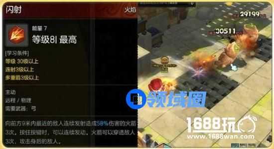 对于弓箭手的主要几个输出技能,我们先从闪射开始说起。释放闪射向前方9米最近的敌人连续发射造成58%伤害的火箭,按住之后可以连续发射,同时该技能还可以穿透敌人3次从而攻击到目标身后的敌人。