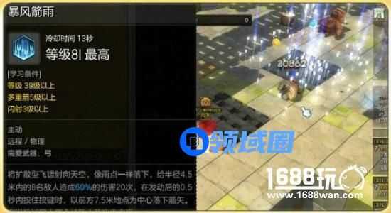 暴风箭雨,从功能上可以定位为一个持续性攻击的技能,我们将扩散性的飞镖射向天空,在天空中爆炸之后的箭雨会像雨点般的落下,对半径4.5米内的敌人造成60%的20次伤害,最多不能超过8名目标,在使用上还可以通过蓄力来达到远射的效果,让我们在副本的同时不需要离BOSS太近也可从容释放技能,避免了由于距离过进从而导致自身受到伤害。
