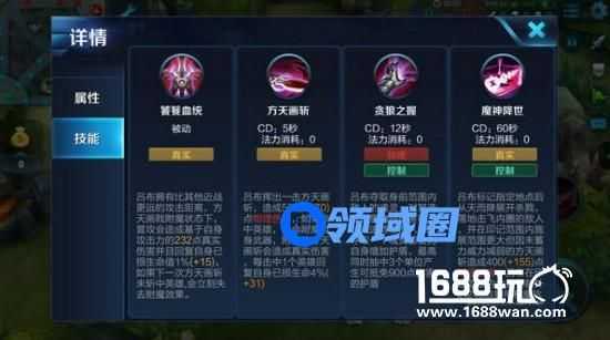 吕布的群控与回复技能,该技能适合切入团战而不是开团,当敌人被队友控制住时当头盖下一个大招能让敌人无法逃脱。原地站撸时也可以用这个技能来控制与自保,和一技能一起使用有恐怖杀伤力。