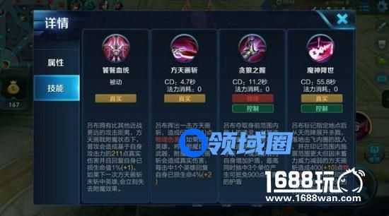 二、技能篇1、被动:吕布的普攻和1技能距离比较远,很多时候可以打到卡不好位的脆皮,要灵活走位用距离打到敌人。另外被动按自己最大血量回血,这里就看情况出不死鸟之眼或魔女斗篷,也是我出装只出小斗篷的原因,看对方阵容再说。