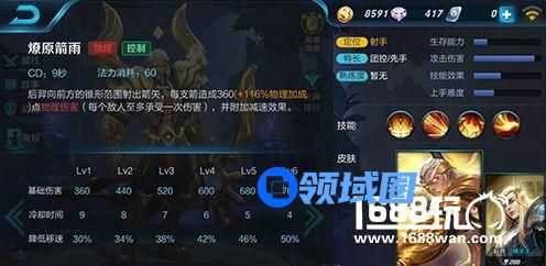 燎原箭雨:向前方锥形范围射出箭矢,每支造成物理伤害,并减速。这个技能的输出其实不是很高,但是胜在附加了减速,并且范围比较广,在留人的时候能发挥重要作用。原则上在前期是在对方残血的时候使用,后期团战的时候就要先放一波,然后再用1技能。