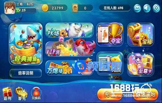 游戏中除了经典玩法外,还为玩家增加了PK场、VIP房、万炮场。玩家们可以在游戏中创建VIP房邀请好友前来捕鱼,也可以到好友房间中和他深入比拼捕鱼技巧。