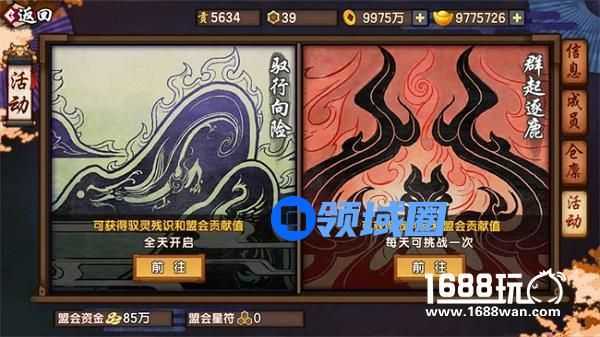 现有盟会活动有两种:驭行向险和群起逐鹿。玩家参与较高等级的盟会活动后,即有几率获得绝世装备碎片。