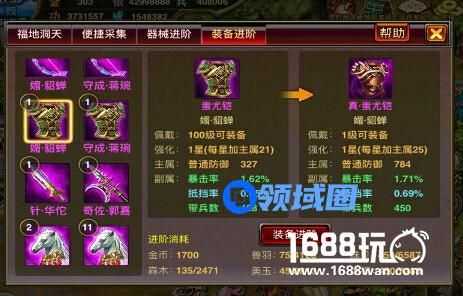 不要以为装备是你的身外物,它们可是你安身立命的宝贝,尤其是在三国乱世,更是要依仗装备了。在游戏中,当玩家等级达到120级就可以开启我们的装备进阶功能了,进阶后的装备比之前的装备在属性要高出一大截,装备的进阶过程是红色→紫色→真紫→橙色。人何成绩都不是一蹴而就的,装备的进阶和战守器械的进阶有一定的相似之处。装备完成进阶过后会根据当前强化等级所消耗的银币,折算成进阶后相同数量的银币所能达到的强化等级,而我们之前洗练的副属性等也会原封不动的保存下来。