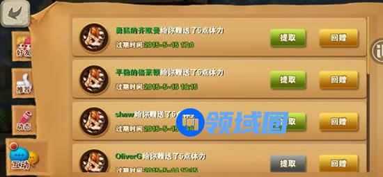 好友之间可相互赠送体力,在互动面板中,可以处理其他玩家跟你之间的互动消息。