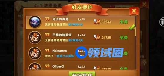好友助战在普通冒险3-5开启,点击挑战即可打开好友助战面板。