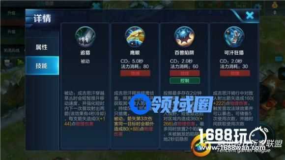 使用技巧成吉思汗较于依靠经济的发育,但是兵线的经济并不算多,因此推荐在野区进行发育,之后不断的进行野区和线上的游走来进行发育。与人对战时可以先手二技能打出减速效果,之后利用草丛进行游走输出,利用三技能衔接一技能打出伤害。玩成吉思汗要注意以下几点:1尽量对同一个目标攻击三次,这样可以让他打出更高的输出。2:要利用草丛加速的效果进行输出。3二技能的陷阱最好释放在敌方的必经之路或者敌方的死角。