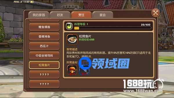 好友系统指的是双方好友都有家园系统后将能进入对方家园,协助对方家园所做的一些事。烹饪就是指在家园中所种植的与钓鱼系统所收获的材料将可以在烹饪栏里进行烹饪,烹饪不仅仅增加自己的料理等级。更重要的是烹饪出的食材能给自己增加大量的有益BUFF。不同的食材能增加不同的活动中所给予的增益BUFF。(包括巢穴、副本、女神之泪、BOSSRUSH、多人深渊等等一系列的加成)拿上图所比方松茸鱼片所带给的增益是提升5%伤害和10%防御(只使用于龙本和巢穴)持续一天。