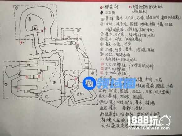 香囊、酒罐、怨灵(夜晚限定)、中低级灌木(靠近汐见川)、中低级木材(靠近竹雀坡)