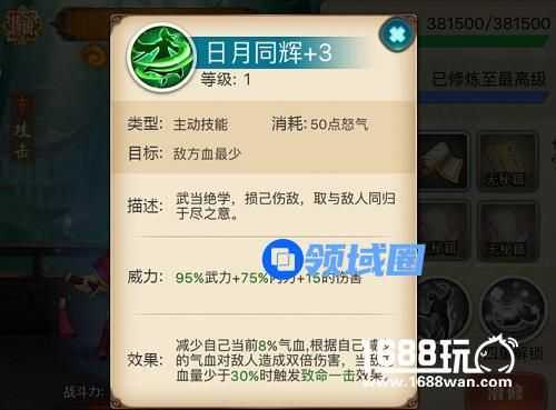 主动技能:日月同辉武当绝学,损己伤敌,取与敌人同归于尽之意,作用目标敌方血量最少侠客,造成95%武力+75%内力+一定的技能等级伤害。同时减少自身当前8%的气血,根据自己减少的气血对敌人造成双倍伤害,当敌方血量少于30%时触发致命一击效果。