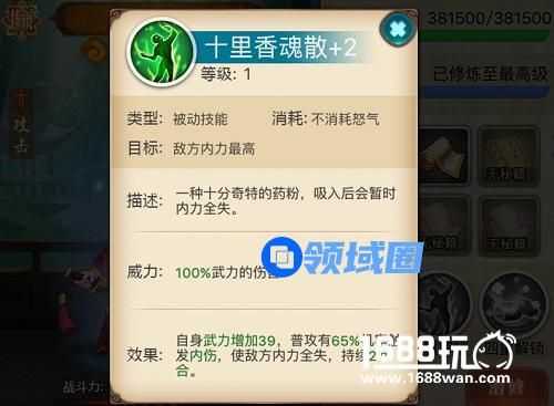 被动技能:十里香魂散作用目标敌方内力最高,可为自身增加一定的武力属性,同时普攻有65%机率触发内伤,使敌方内力全失,持续2回合。此技能虽无致命一击效果那般霸道,但65%机率触发内伤的作用,依旧不容小觑,不仅具有一定机率控制敌方内力型攻击侠客输出能力,如果命中了敌方治疗侠客,更能起到逆转战局的作用。