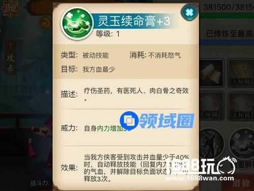 作用目标我方血量最少的侠客,可为自身增加一定的内力。同时当我方侠客受到攻击并血量少于40%时,自动释放技能(回复内力160%的气血,并解除目标负面状态),可释放3次。