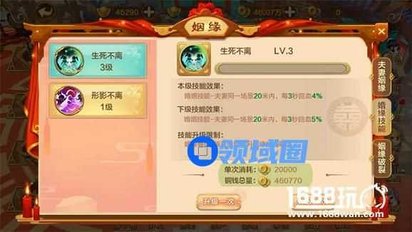 玩家还将获得夫妻技能形影不离与生死不离。消耗铜钱可提升姻缘技能等级,但技能等级会受到姻缘等级的限制。