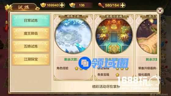 二、日常试炼:每日必做的成长快线在日常试炼玩法中,玩家可以挑战多种试炼副本,每种副本都有着自己独特的奖励,如修炼之地可以为玩家提供大量经验;秘宝矿洞中玩家可以获得大量宝石素材及生产材料;守卫摩云顶则可以产出大量的武功及气功道具。不同试炼的开启时间有所不同。参加试炼需要消耗一定的体力,在体力有限的情况下,要优先选择自己最需要的试炼参加哦