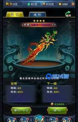 花费金币可以进行装备强化,强化后的装备可以大幅提升对应的属性。装备强化等级不可以超过主角等级的两倍。可以采用“强十次”的方式进行快速强化。