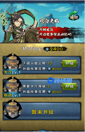只要宗派资金达到建筑升级花费的要求,建筑升级后就可以招募更多的成员,在商店里购买更高级的道具啦,还有好多功能等待你来探索的。