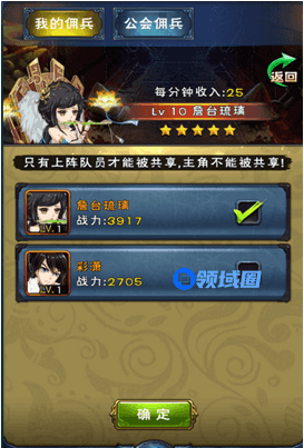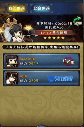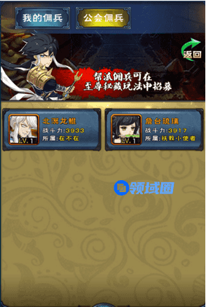 每天每位玩家可以共享一个主将做为宗派佣兵,在“至尊秘藏”里被招募。被招募的佣兵可以帮助招募玩家提高战力,成为成败之关键哦!