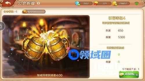 (2)公会初始等级1级,公会等级影响公会建筑的等级上限、公会人数上限等;可由会长与副会长消耗公会资金进行升级。【公会祈福】