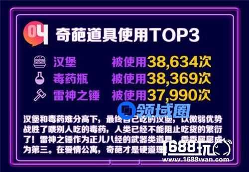 奇葩道具TOP3新鲜出炉啦~最终“汉堡”以265次的微弱优势战胜了“毒药瓶”,人类已经不能阻止吃货的繁衍啦!毕竟汉堡是回血神器~听着就很厉害的“雷神之锤”屈居第三,不知道雷神托尔知道后会不会生气?【签到送服饰 变女装大佬】