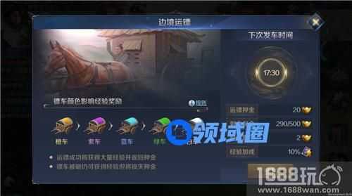 跨服边塞运镖活动每天12点开启,活动开启后,点击主界面的运镖按钮,扣除20元宝的押金后会在自己的靖远城出现一辆镖车,镖车每半个小时自动发车一次,发车前可以通过换镖令更换镖车的品质,品质越高获得的经验越多。
