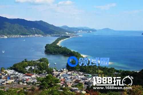 天桥立是位于京都府北部的风景胜地,在将日本海的阿苏海与宫津湾分开、全长约3.6km的沙洲上,约8000株松树组成的街道树连绵不断。被列为与松岛、宫岛并列的日本三景之一。据说由于其形状看似天上舞动的白色架桥,所以取名"天桥立"。