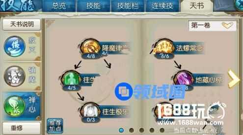 第一卷:降魔律言4级,法螺常念6级,菩提荫佑4级,地藏心经8级,灵魂绽放2级。(24点)