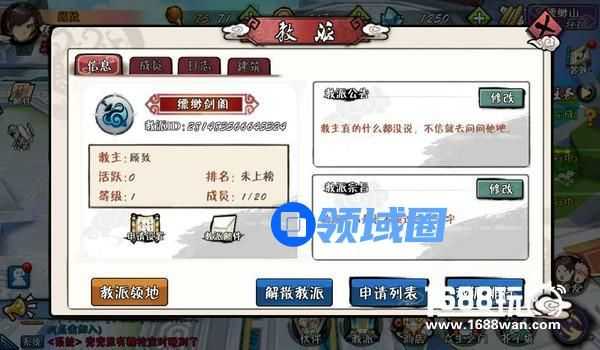 在教派的主界面中,我们可以看到教派的公告,宗旨,申请列表,排行榜,以及教派成员,日志,以及建筑列表。【教会建筑】