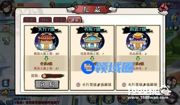 除了以上的界面之外,教派的功能性还集中在其建筑之上。我们进入建筑页面之后可以看到目前共有三大建筑:“大厅”“书院”“商店”,其中大厅属于基础设施用来增加人口,书院和商店则是能给帮众带来福利。【教会玩法】