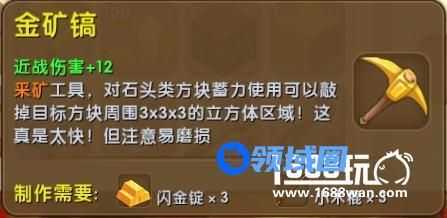 迷你世界黄金镐制作方法介绍黄金镐的制作材料包括:闪金锭X3、小木棍X3,集齐材料后制作即可获得黄金镐了。黄金镐是非常高效的采矿工具,但是也是比较容易磨损呢,所以小伙伴们可以多做一些以备不时之需哦~