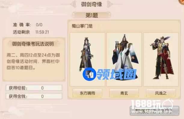 “御剑奇缘”活动,每次活动设10道题,答对与答错均有经验、银币奖励。