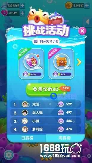 点击游戏界面挑战活动按钮,即可参与和好友的竞赛活动。在限定的步数之内,击败更多的鲨鱼。每周击败的鲨鱼数量可以累计,累计到指定数量即可领取奖励,击败的鲨鱼数量越多,得到的奖励就越多。玩家可以在挑战活动界面看到每周和每天击败鲨鱼数量最多的好友排行榜,在这里可以和好友开始竞赛哦!6.过关技巧