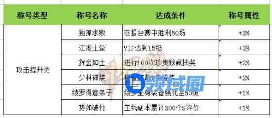 攻击类称号主要可以分为PK类、充值类、装备类、副本类。以下表格已按提升属性值的高低排序,玩家可按优先级的高低完成称号。其中“独孤求败”的性价比为 最高,玩家只要在擂台PK赛中完成胜利50场的规则即可在现有战力中提升3%的攻击力,想要强化攻击力的玩家不防可以选择。