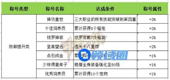 防御类称号主要可以分为技能类、宠物类、装备类、活动副本类。以下表格已按提升属性值的高低排序,玩家可按优先级的高低完成称号。防御类共有7个称号,技能类和宠物类各有一个增值3%防御属性的机会。想要强化防御力的玩家不防可以选择。