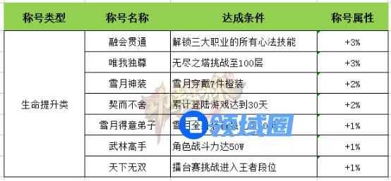 生命类称号主要是综合类居多,可以分为技能类、装备类、活跃类、战力类、PK类、活动副本类。以下表格已按提升属性值的高低排序,玩家可按优先级的高低完成称号。其中“契而不舍”为性价比最高,虽然只增值2%的生命属性,但是达成条件非常容易。