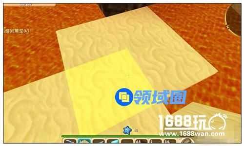 靠着石块通道,开始用细沙块将周围的岩浆都填起来,硫磺晶砂的部分也要填上。因为细沙块会自动沉到岩浆底部,所以我们只要从上方一直叠细沙块直到和岩浆齐平就行了。记住硫磺晶砂的位置,在周围填细沙块的范围要大一些,方便挖取石头,同时避免掉落到岩浆中烧死。