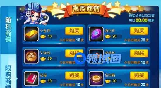限购商铺中的道具购买每天都是有数量限制,购买数量无法超过限购数量,重点:限购商铺的商品单价是根据当前购买该道具的数量而增加,如小金砖,每日 限购10个,购买前5个时单价为10元宝,购买第六个单价则变为15元宝,玩家一次性购买10个的话,总价计算并非100元宝,而是125元宝。其他道具 价格也是同样的机制增加。