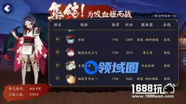 吸血鬼姬应援排名目前位于第13名,勋章总数464.4万。