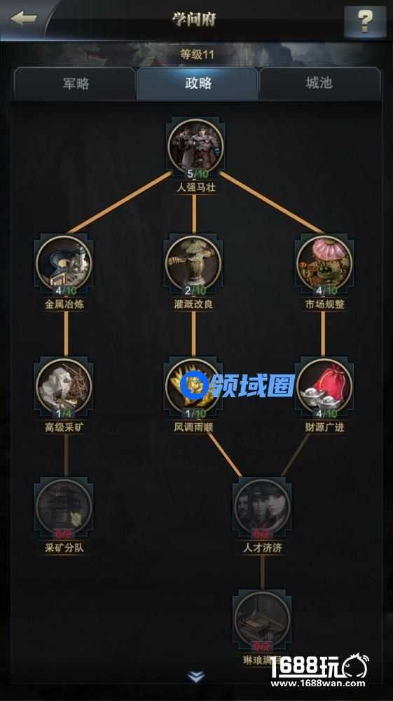 除了宫城升级外,科技升级也同样需要大量资源消耗,所以主公记得先对重点科技进行升级。升级军略中的【调兵遣将】技能可提升部队战力,【雄狮百万】科技研究可增加同时出征队列,这样主公便可拥有2队兵力,1队可派遣去打地,另一队则派去进行采矿,如此将对前期的发展建设有很大优势。接下来就是囤资源升级政略中的【高级采矿】采2级矿;升级城池里面的【分城营造】,这样可比别人更快到1-7级资源带里建造分城,打更多的高级土地。接下来可升级更高阶的高级矿采3级矿,屯下更多铁矿资源,为以后的升级、征战打下坚固的基础。