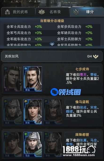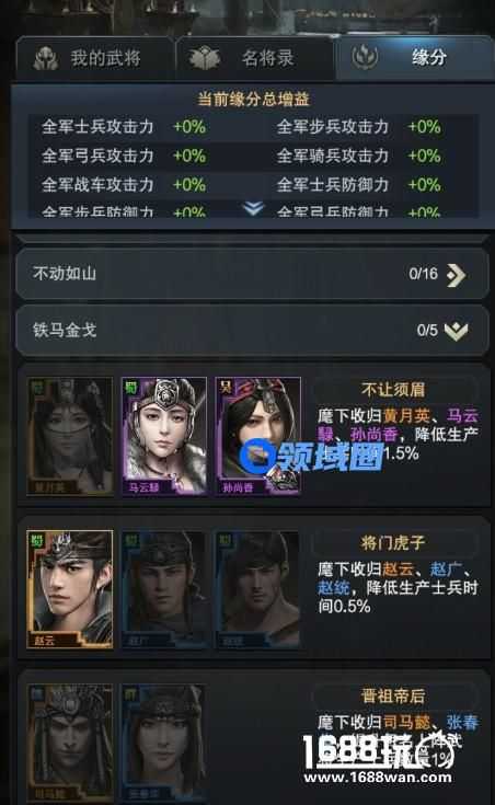 当主公寻访到武将而不登庸时,是无法激活缘分的。而一旦缘分被激活,主公便能永久享有该缘分条目的增益。更让人惊喜的是,即使对本条缘分中的武将进行下野操作,即武将不在麾下时,此缘分的增益也将会继续存在。在游戏中,缘分所达到的效果取决于构成该缘分的武将数量及品阶,目前《三国群英传-霸王之业》中组成单条缘分的武将大概为2-3名,而武将缘分也和武将组成数量和品阶息息相关。缘分内武将组成数量越高,缘分的效果越强;缘分内武将品阶越高,缘分的效果自然也会越强。