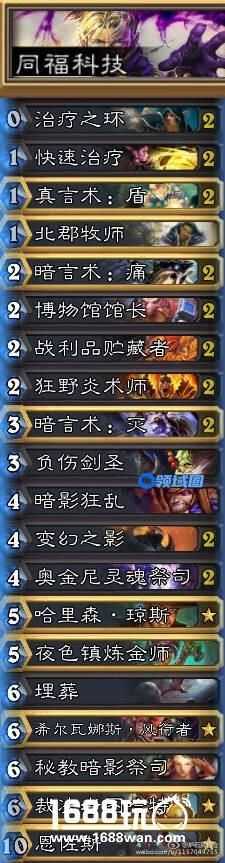 新版本刚出之际,很多以前的牧师忠实玩家都抛弃了玩家,为什么?因为牧师少了炸弹,再怎么脏也没用,解场乏力啊。然而经过几个月的适应以及对新卡的理解,牧师其实也是能组出有强度的卡组的。瓦娘,好吧,他挂名同福科技,是同福战队想出来的这套恩佐斯环牧,就在天梯这个战士、猎人众多的险恶之地生存下来,并顽强的登上传说。下面是卡组图片,我会具体介绍一下卡组构成,以及一些打法。