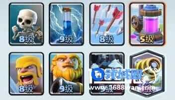 目标3000白卡升级9级优先级,小电>苍蝇海>家驹=箭雨,这样能电死9级刀哥布林,并且苍蝇不会被10级小电秒掉。家驹作为主力蹭血能保证强度。
