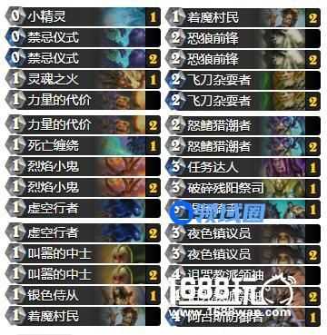 禁忌仪式:召唤出来的11可以和力代、恐狼、飞刀、夜色镇、阿古斯、邪教大师有很好的配合。即使我们没有费用,这张卡也会让你的任务达人+1+1,有时候是至关重要的,对付后期卡组要注意对方AOE的使用,不要在没有任何AOE使用的情况下贸然打出这张卡。