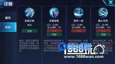 被动技能:杀意之枪技能解析:韩信输出以及控制的主要来源,攻速加成可以打出更多平A以及1,2技能均可触发被动击飞效果,能打有能控。一技能:无情冲锋技能解析:韩信主要输出技能,一段可挑飞敌方,二段可进可退,配合韩信的普攻,可以打出更高伤害以及被动效果。二技能:背水一战技能解析:长距离短CD位移技能,可触发攻击特效以及被动技能效果,并且此次攻击为范围攻击。飘逸的位移让韩信有着更灵活的进攻和撤退能力。