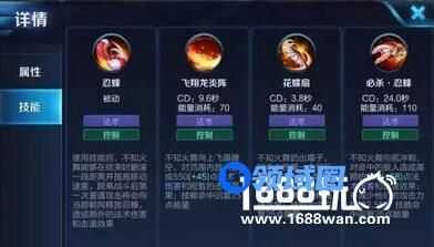 二技能:花蝶扇技能解析:不知火舞的主要消耗技能,CD短,伤害高,并且附带减魔抗和减速效果,技能成长伤害极高,后期有着恐怖的3扇子致残的威胁。但是需要精准的技能释放才能有着恐怖的poke能力。三技能:必杀丶忍蜂