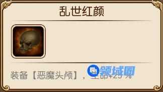 乱世红颜:装备恶魔头颅,生命+25%,(妲己的绝色容颜让人无法起敬畏之心,所以平时要拿恶魔头颅以示震慑!)