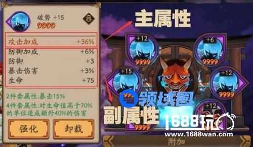 强化最多到+15,其中主属性随着强化会得到巨幅提高,而副属性只有在+3的倍数(3/6/9/12/15)时随机获得一项提升。
